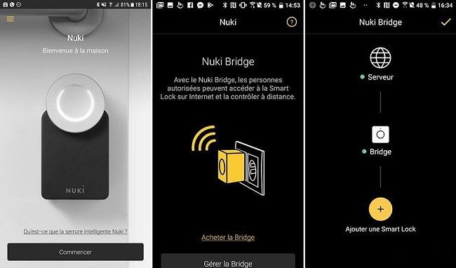 Il ne reste plus qu’à installer l’application Nuki sur votre smartphone, disponible gratuitement sur les stores Apple et Android. Elle va vous permettre de configurer votre serrure SmartLock, et de la piloter en local via la connexion Bluetooth, ou à distance et avec plus de confort, en ajoutant la connectivité internet via le bridge Wifi.